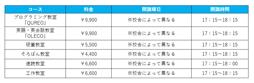 ※校舎により開講習い事が異なります。詳しくは各校舎へお問い合わせ下さい。