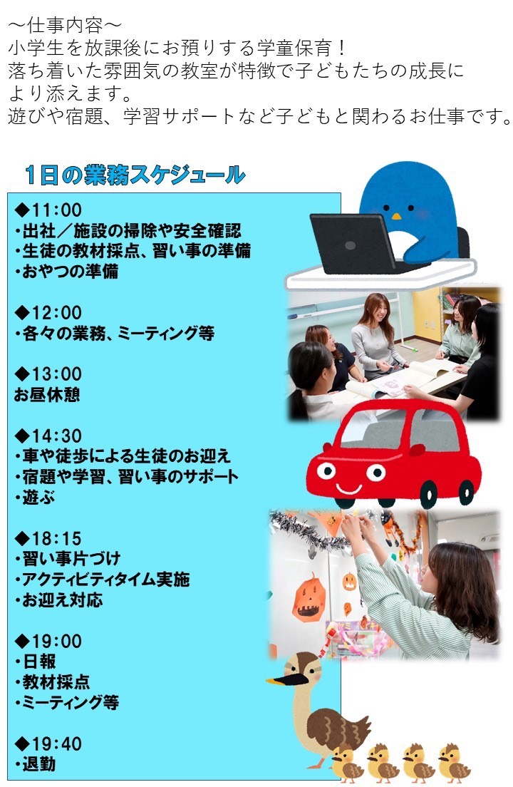 ~以下の経験・資格をお持ちの方は優遇させていただきます~ ◎接客業 ◎子どもが大好きな方 ◎教育関係の大学卒、経験 ◎教員免許証(幼・小) ◎普通運転免許証